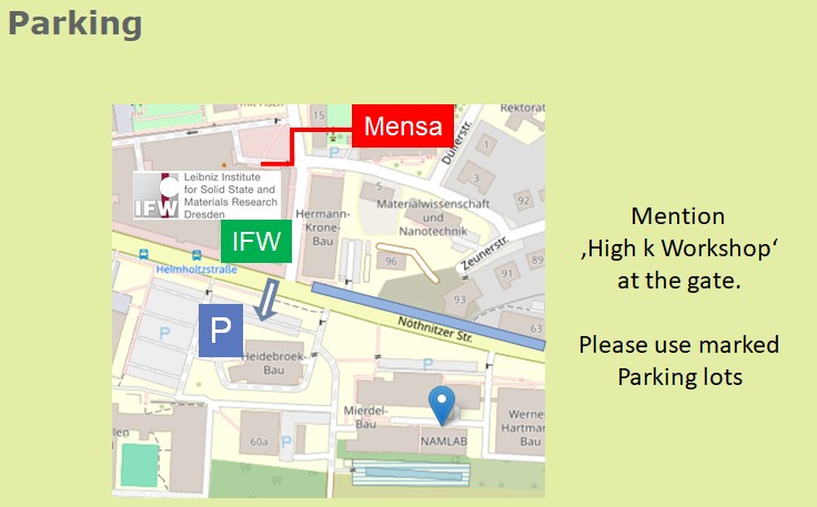 Fifteen parking spaces are available across Noethnitzer Strasse. Please mention the „High-k Workshop“ at the barrier.