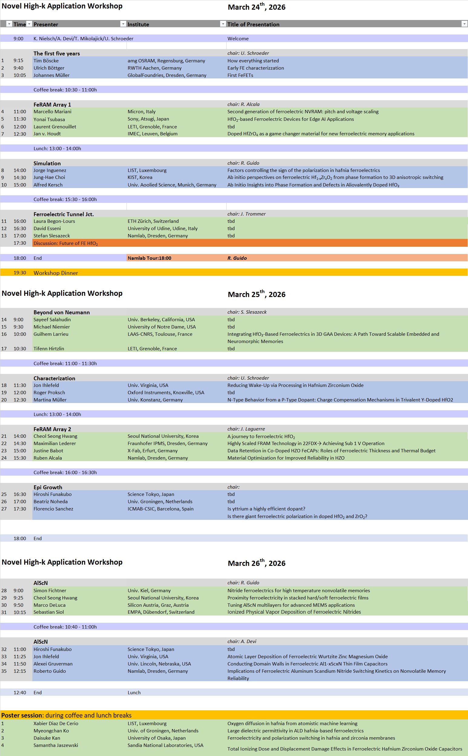 In this series of annual workshops, NaMLab has created a stimulating platform for application-oriented scientists to exchange ideas and discuss recent experimental results on devices, process technology, reliability, and characterization of high-k dielectrics integrated into silicon-based micro- and nanoelectronics. As in previous years, the causes for the formation of ferroelectric properties in HfO2 and ZrO2 and the application of these films will be discussed followed by the newest results of ferroelectric AlScN.